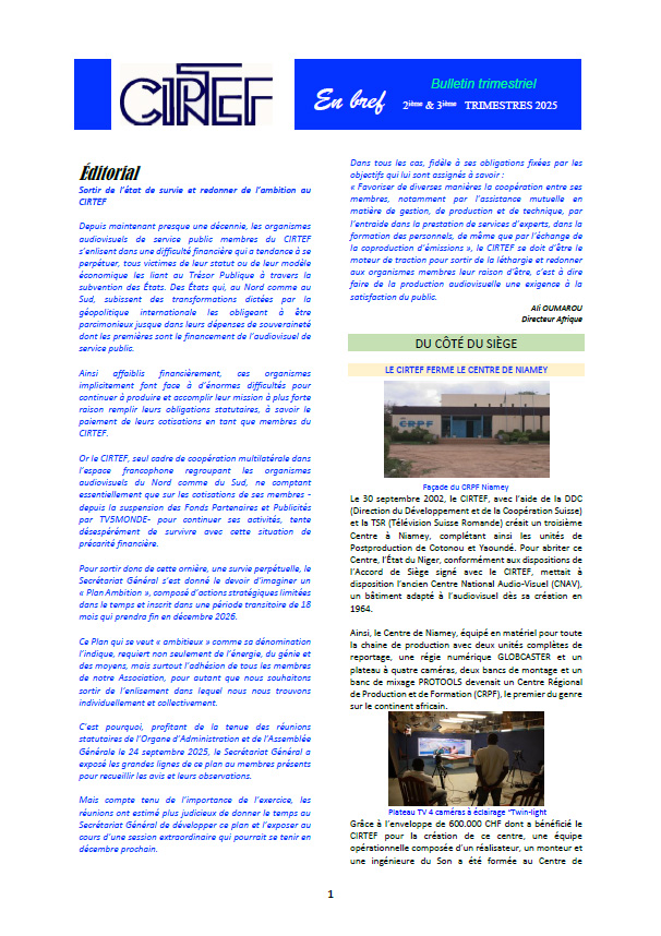 Depuis près de dix ans, les organismes audiovisuels publics membres du CIRTEF traversent une crise financière structurelle. Dépendants des subventions d’États eux-mêmes contraints par les transformations géopolitiques internationales, ces organismes peinent à accomplir leurs missions fondamentales et à honorer leurs obligations statutaires, notamment le paiement des cotisations au CIRTEF.