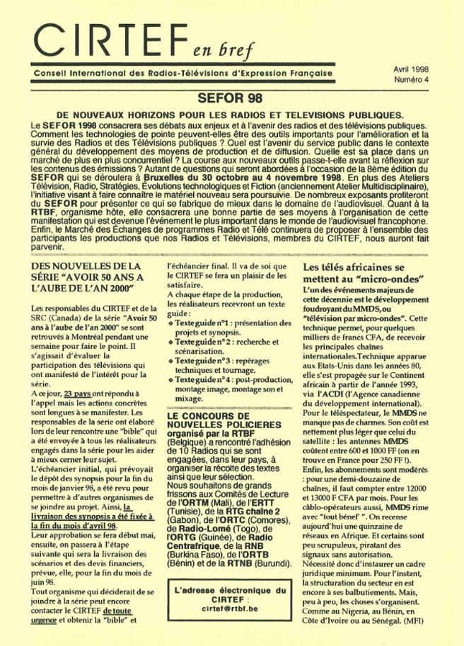 Le SEFOR 1998 consacrera ses débats aux enjeux et à l’ avenir des radios et des télévisions publiques. Comment les technologies de pointe peuvent-elles être des outils importants pour l ’amélioration et la survie des Radios et des Télévisions publiques ? Quel est l’avenir du service public dans le contexte général du développement des moyens de production et de diffusion. Quelle est sa place dans un marché de plus en plus concurrentiel ? La course aux nouveaux outils passe-t-elle avant la réflexion sur les contenus des émissions ? Autant de questions qui seront abordées à l’occasion de la Sème édition du SEFOR qui se déroulera à Bruxelles du 30 octobre au 4 novembre 1998.