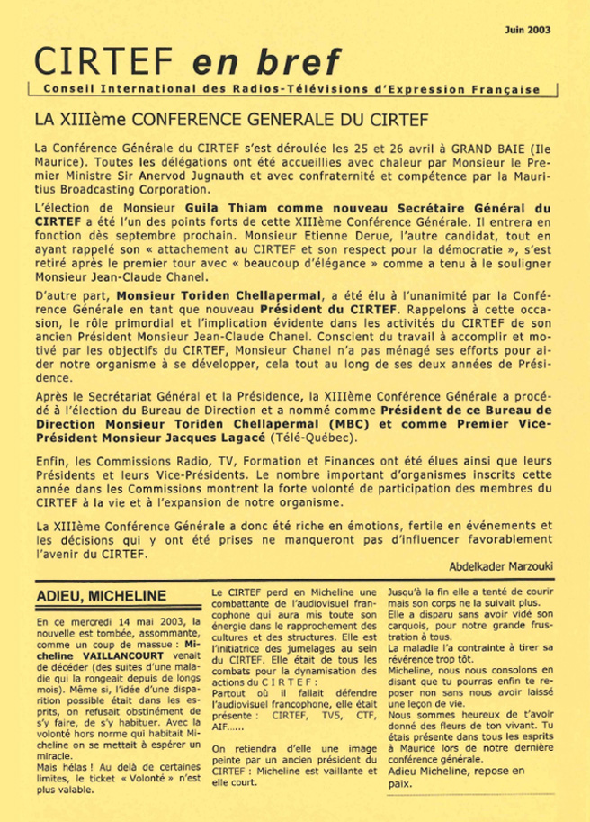 D’autre part, Monsieur Toriden Chellapermal, a été élu à l’unanimité par la Conférence Générale en tant que nouveau Président du CIRTEF. Rappelons à cette occasion, le rôle primordial et l’implication évidente dans les activités du CIRTEF de son ancien Président Monsieur Jean-Claude Chanel. Conscient du travail à accomplir et motivé par les objectifs du CIRTEF, Monsieur Chanel n’a pas ménagé ses efforts pour aider notre organisme à se développer, cela tout au long de ses deux années de Présidence.
