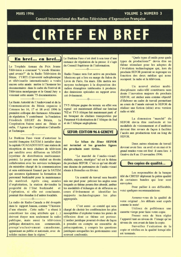 Un nouvel atelier multi disciplinaire radio-télé constituera sans doute l’innovation majeure du prochain SEFOR; cet atelier aura comme objectif d’élaborer un cadre de travail permettant au cours de l’année suivant le SEFOR de réaliser une fiction (série) avec version radio et télé.